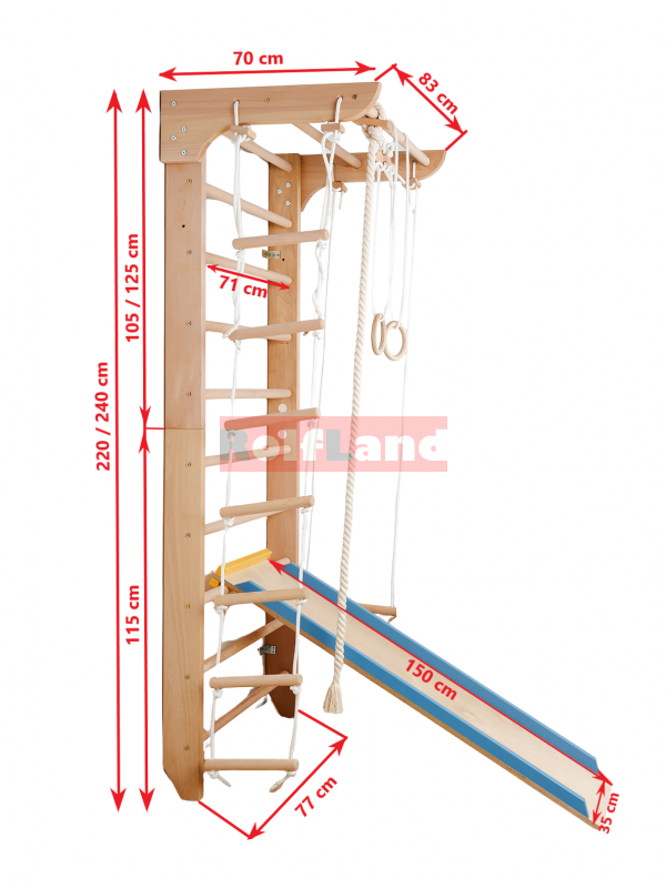 Kiváló alternatívája a szokásos gyereksaroknak kicsiknek és nagyoknak. A bordásfal fokok kiváló minőségű bükkfából-, a függőleges vezetők fenyőfából készülnek. A fa festett és polírozott. 2 éves kortól gyermekek számára alkalmas, de felnőttek számára is használható. A bordásfali gyakorlatokkal fejleszthetők..